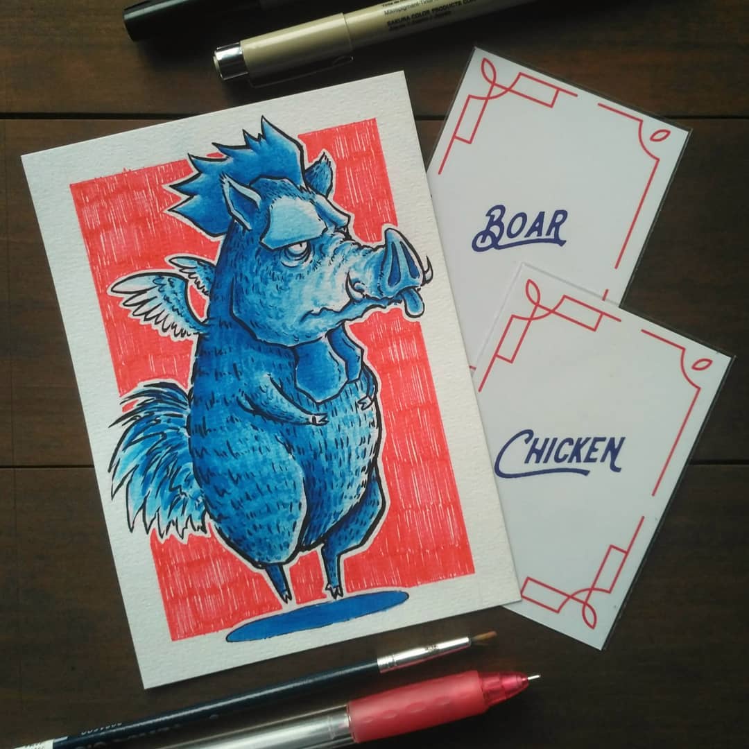 Para ello, creó una baraja con varias palabras como "pirata", "jabalí," zombi "y" barco". Para crear sus ilustraciones, baraja las cartas y toma dos palabras al azar. El resultado son ilustraciones muy divertidas, originales y creativas. ¡Observen!